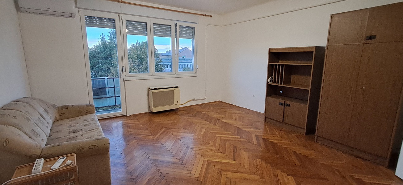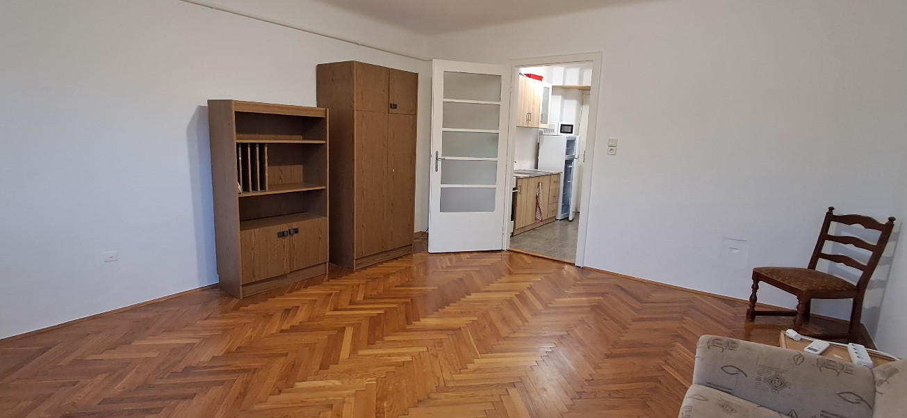 Pécs-Belvárosban Köztársaság téren három emeletes társasház 3. emeletén Déli tájolású felújított 35 nm térmértékű 1 szobás, gázkonvektor fűtéses, klimatizált (új hűtő-fűtő klíma), berendezett, háztartási gépekkel felszerelt, erkélyes, alacsony rezsijű tégla lakás 1 fő, vagy fiatal pár részére minimum egy évre kiadó.