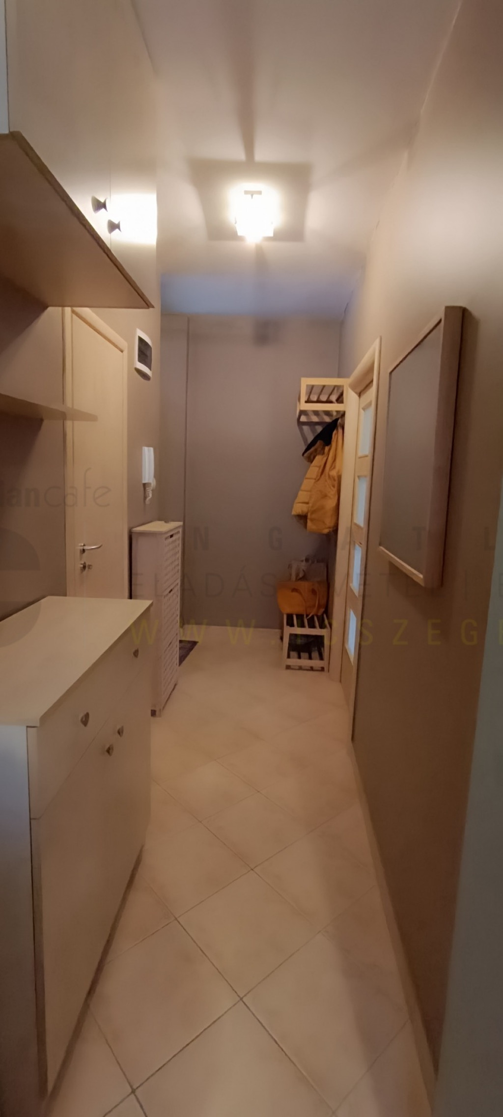 A hálószoba a nappaliból és az előszoba felől is megközelíthető. A gépesített konyha mindennel felszerelt (kombi hűtő, kerámialapos főzőlap, elektromos sütő, mosogatógép, mikro), külön helyiségben kamra is van. A bejárati ajtó és az ablakok is hőszigetelt műanyag nyílászárók, utóbbiak redőnnyel és szúnyoghálóval felszereltek. A WC a kádas fürdőszobában kapott helyet, az ablak világosságot és természetes szellőzést biztosít.