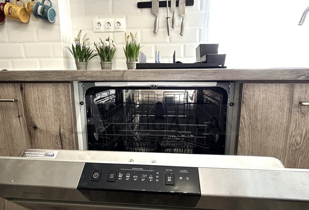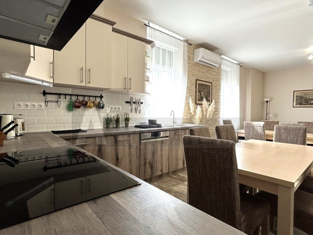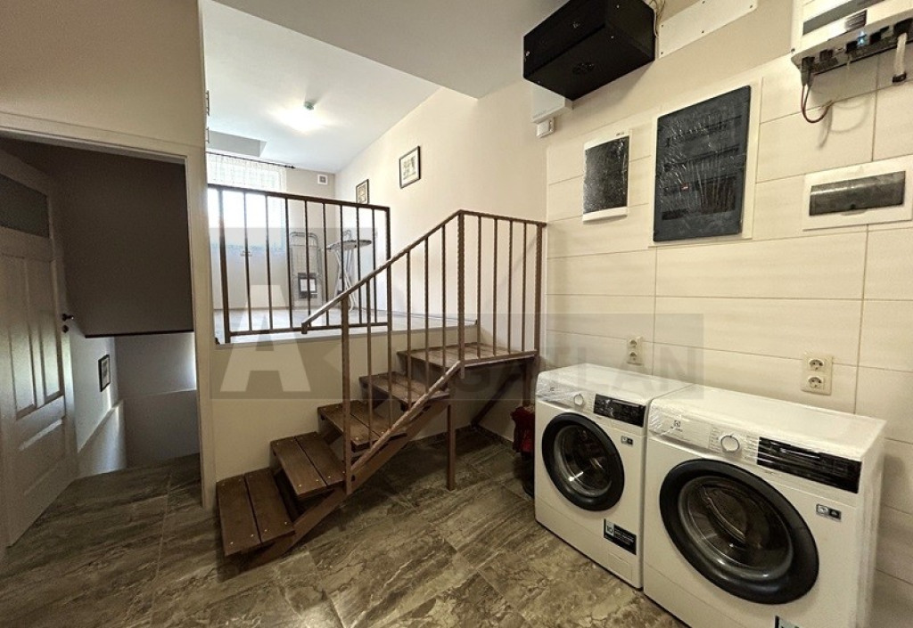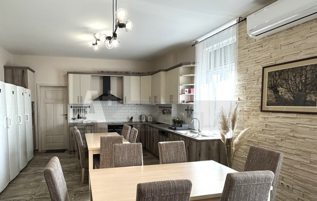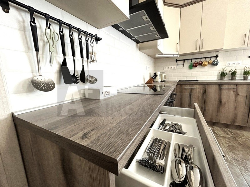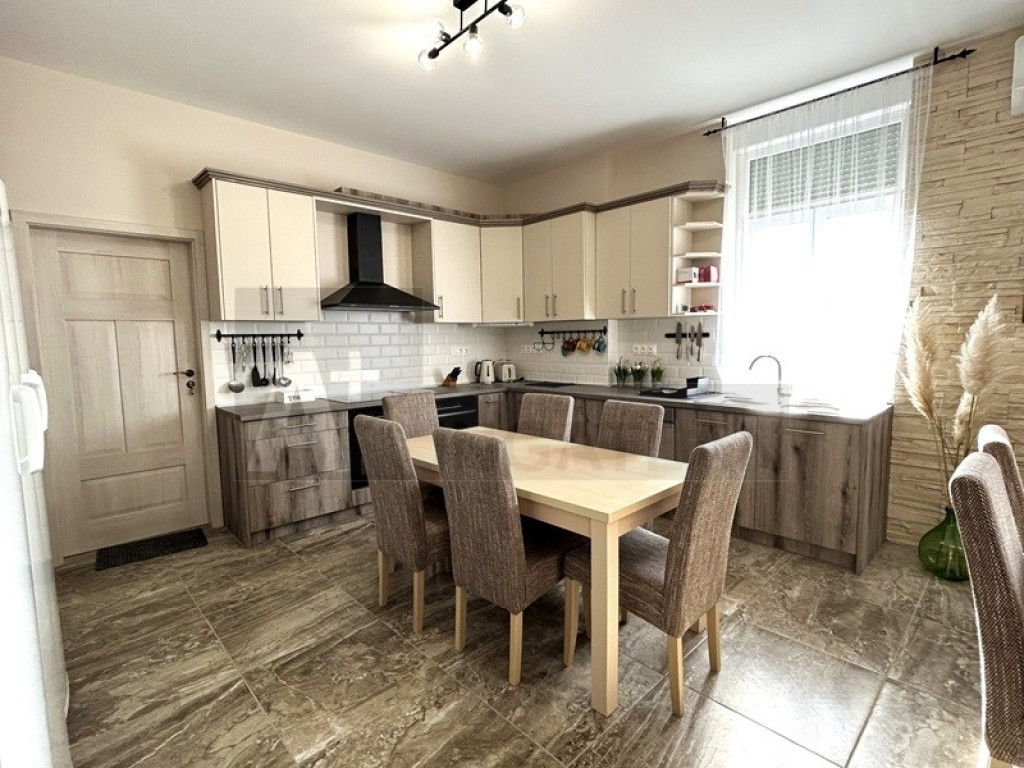 A konyha teljesen felszerelt, gépesített a háztartási helyiségben mosó és szárítógép is van.