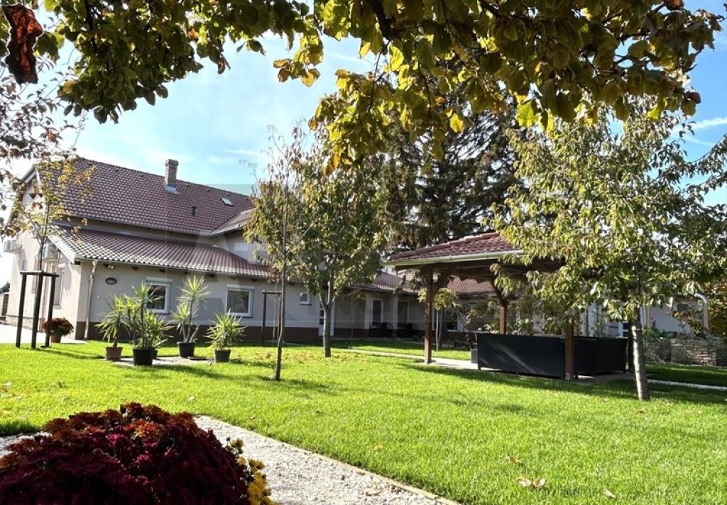 Az udvar parkosított, pihenésre alkalmas kialakításokkal, növényekkel, fákkal beültetett.