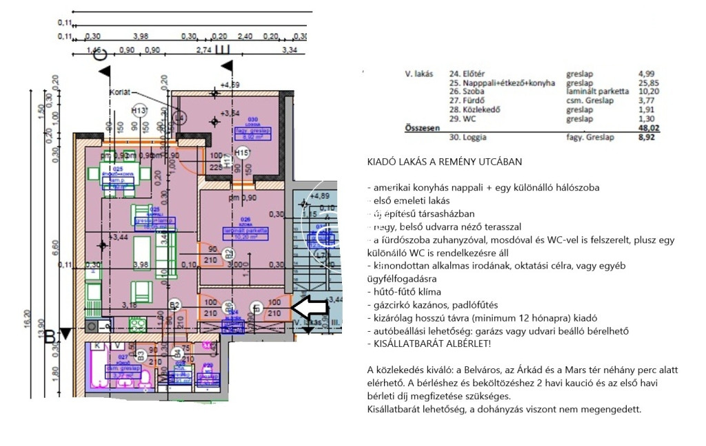 A lakás kizárólag hosszú távra (minimum 12 hónapra) kiadó. Autó számára parkoló bérelhető a zárt udvarban, 20.000 Ft-ért, vagy garázs 40.000 Ft-ért havonta. A közlekedés kiváló: a Belváros, az Árkád és a Mars tér néhány perc alatt elérhető. A bérléshez és beköltözéshez 2 havi kaució és az első havi bérleti díj megfizetése szükséges.