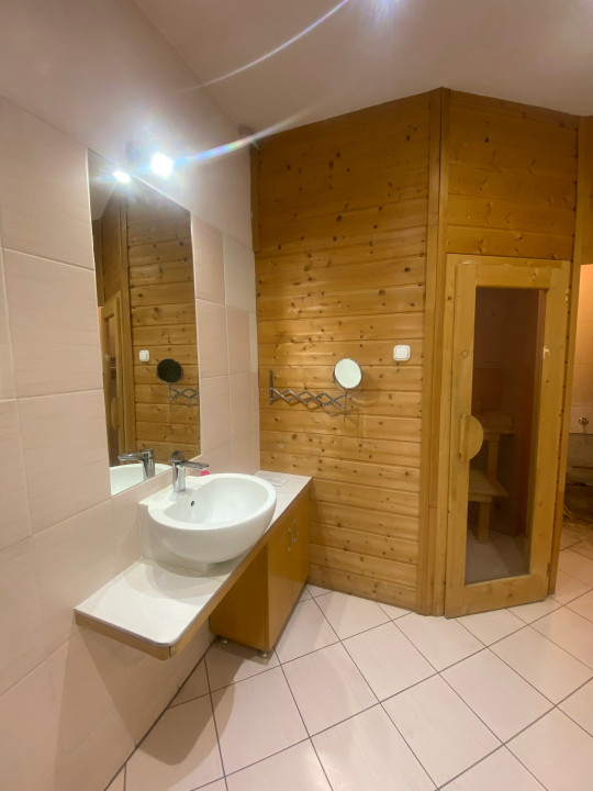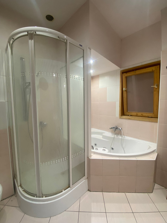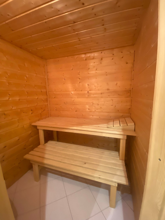A tágas fürdőszobában zuhanykabin, sarokkád és beépített szauna is található, valamint itt kapott helyet a mellékhelyiség is.