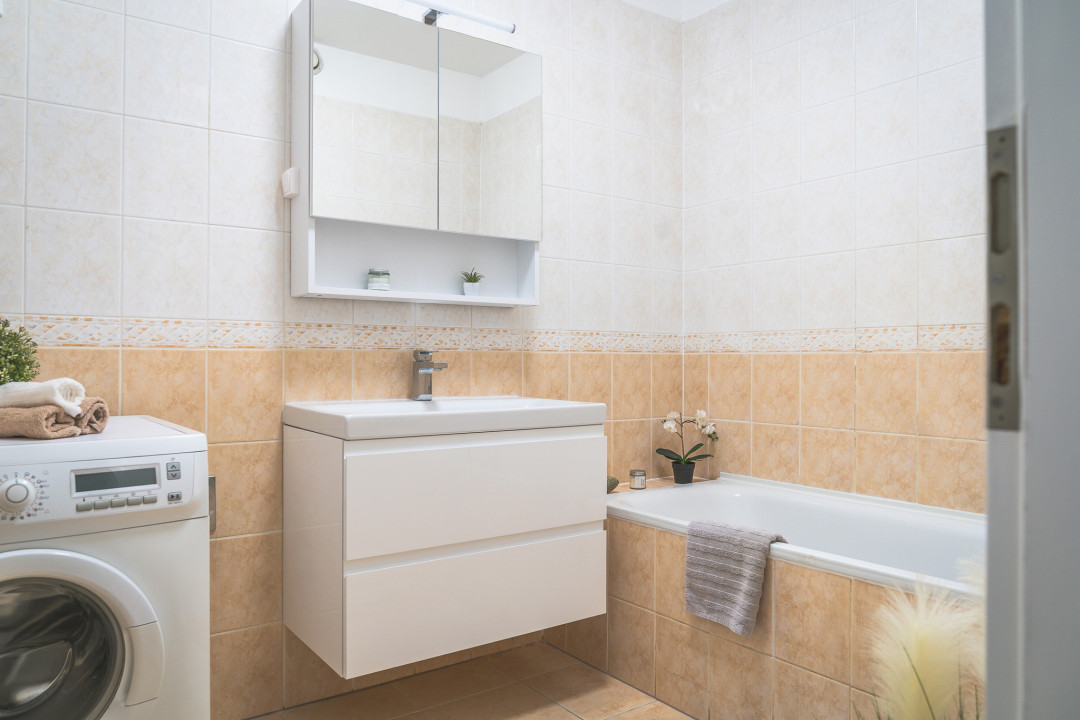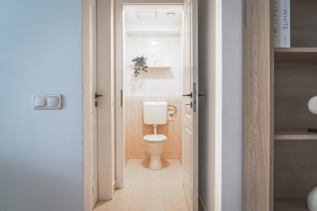 A két szoba között helyezkedik el a FÜRDŐKÁDDAL, mosógéppel felszerelt fürdőszoba, mellette pedig a külön bejáratú WC.