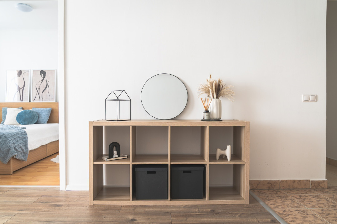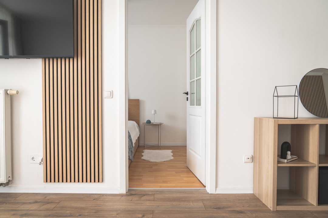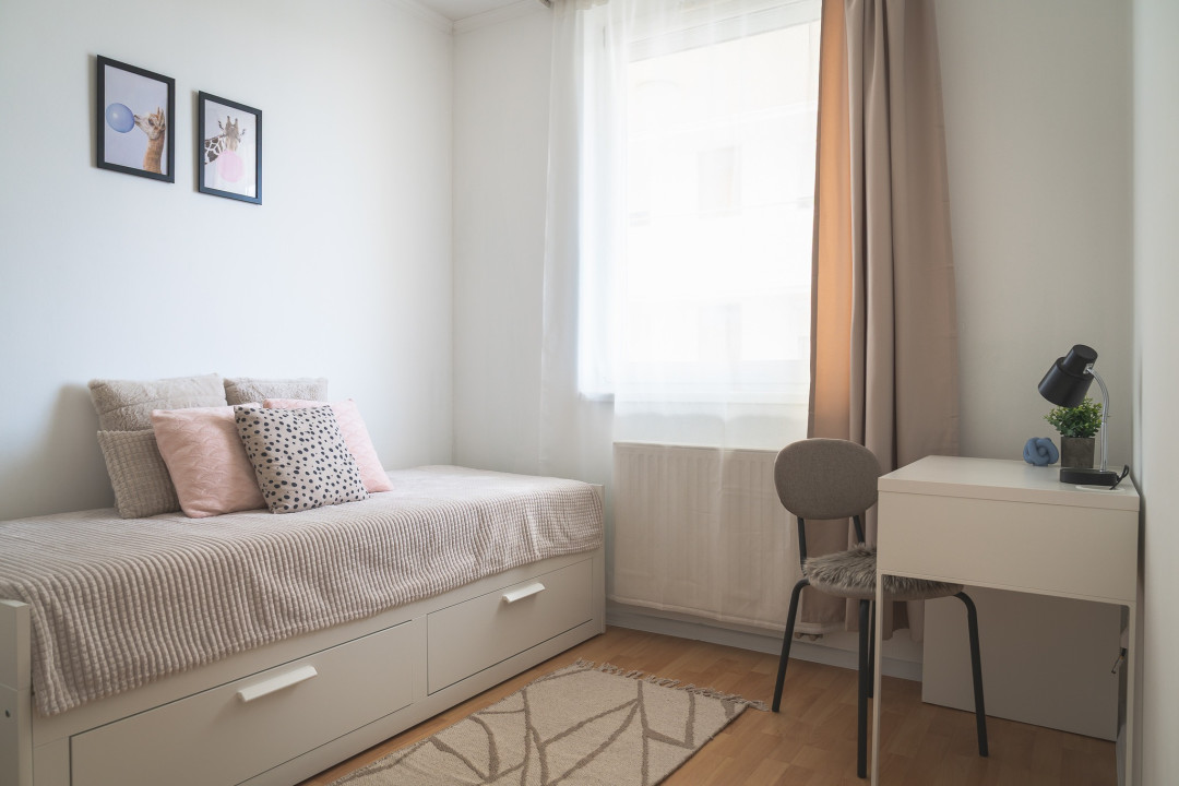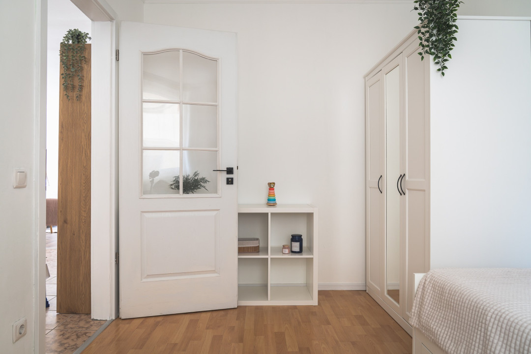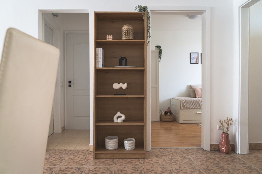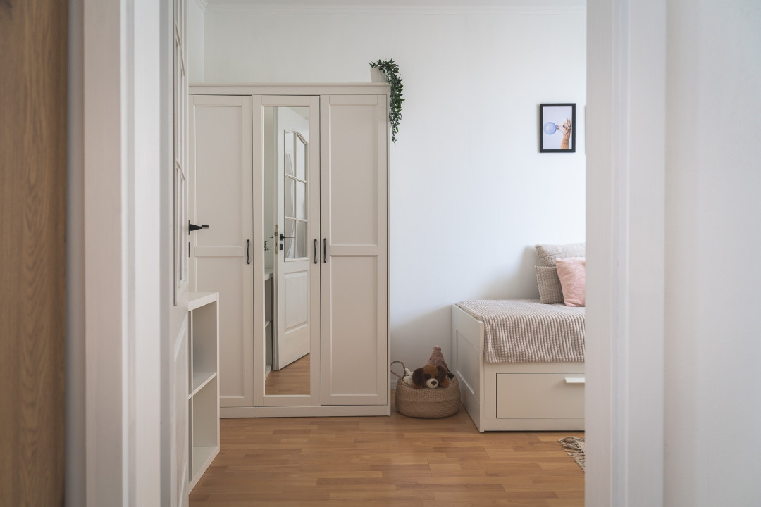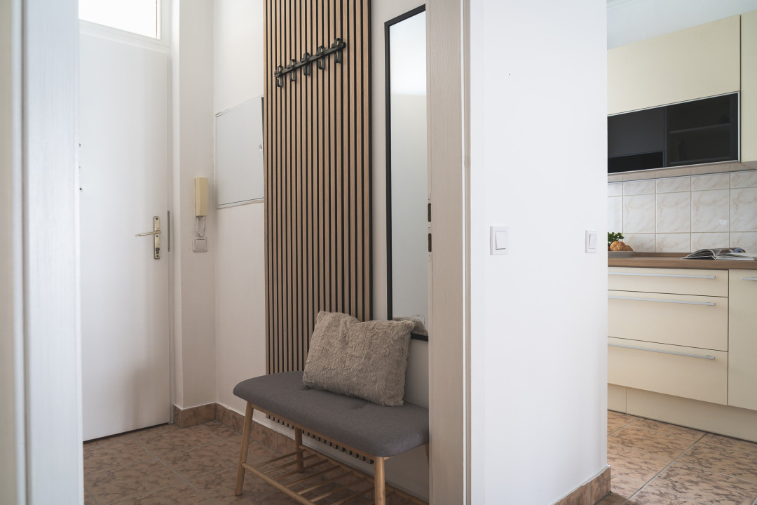 A bejárati ajtón belépve az előszobába érkezünk. Itt kapott helyet a praktikus cipő és kabát tároló. Az előszobából tovább haladva jobbra egy tágas gyerek/vendégszoba/dolgozó szoba lett kialakítva, kinyitható ággyal (80x200 vagy 160x200), íróasztallal, praktikus ruhás szekrénnyel és tároló polccal.