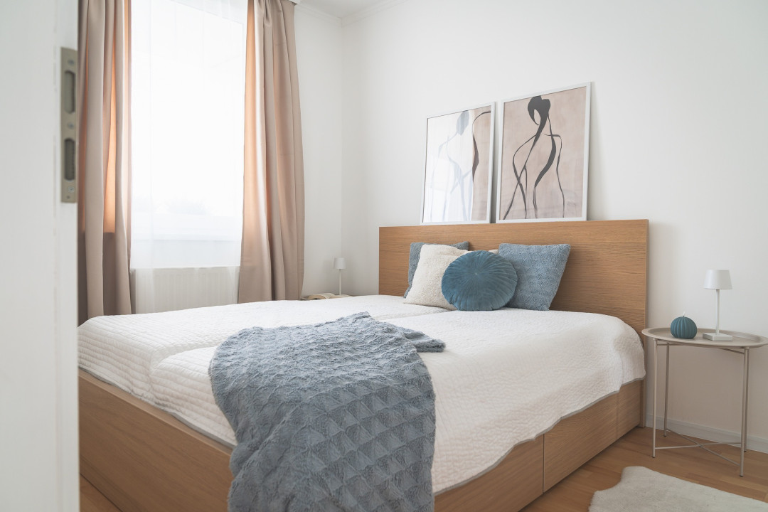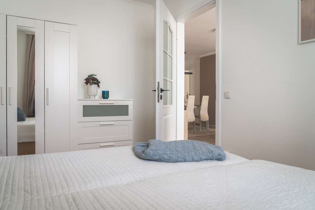 A nappali másik feléből egy tágas külön bejáratú hálószoba nyílik, ami a nyugodt pihenést biztosítja. Itt kapott helyet egy nagyméretű 160x200-as franciaágy, praktikus ágy alatti tárolókkal, egy nagyméretű gardróbszekrény, éjjeli szekrények és egy komód.