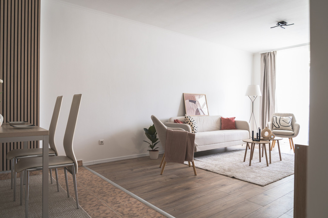 A bútorok, szaniterek, csapok szintén újak, valamint a felújítás során minőségi meleg burkolat került a nappaliba. A lakásban KLÍMA is kiépítésre került.