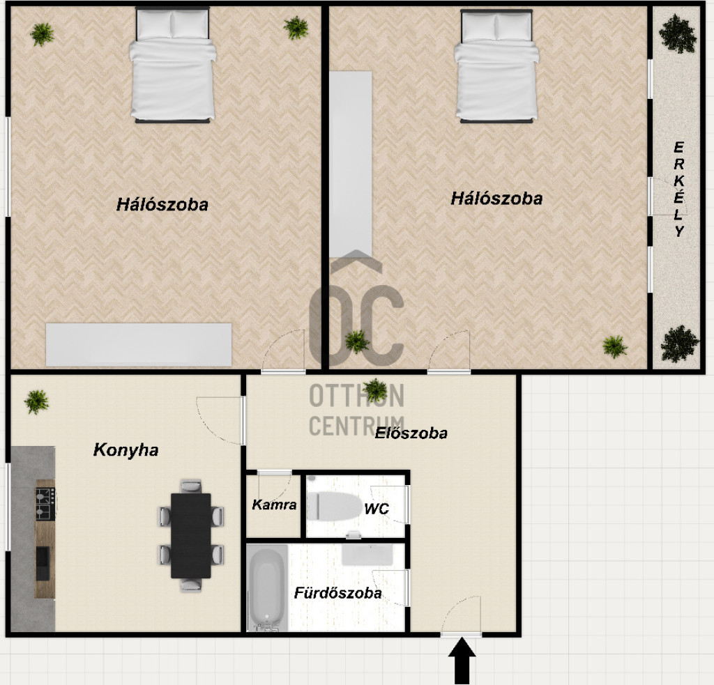A lakás praktikus elrendezésű: mindkét szoba külön bejáratú, így biztosítva a lakók számára a teljes körű privát szférát. Az ablakok műanyagok, redőnnyel felszereltek, így biztosítható a megfelelő fény- és hőszigetelés. A fűtést hőtárolós kályhával oldották meg, mely gazdaságos megoldást kínál a téli hónapokban.