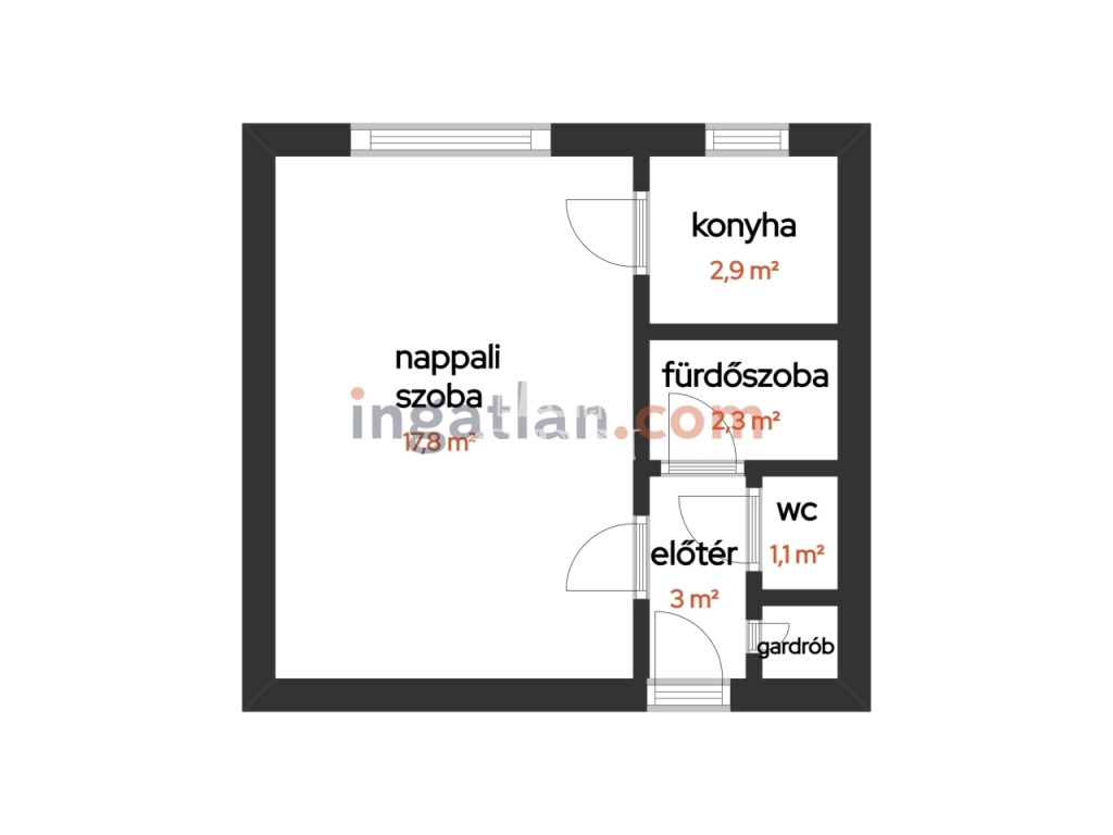 Elosztása: előtér 3 m2, nappali/háló 17,82 m2, fürdőszoba 2,27 m2, konyha 2,89 m2 wc 1,2 m2.