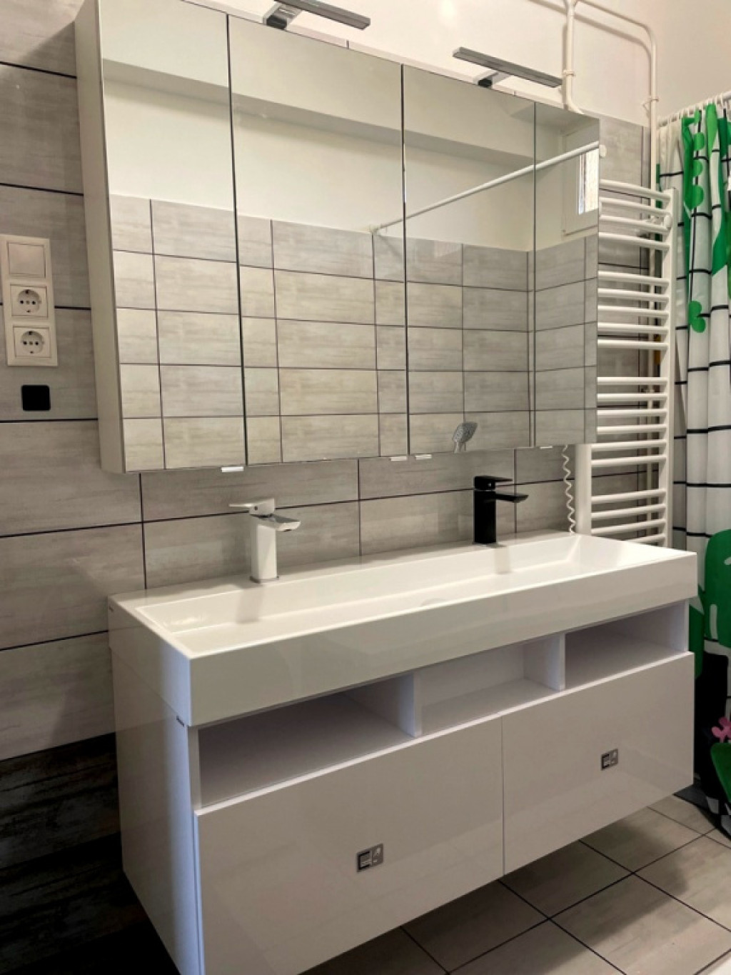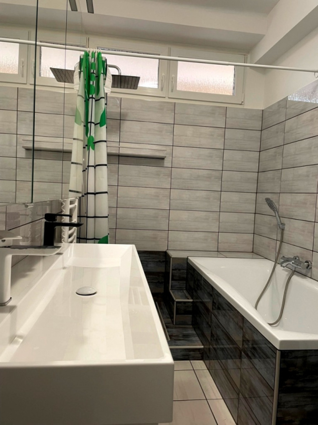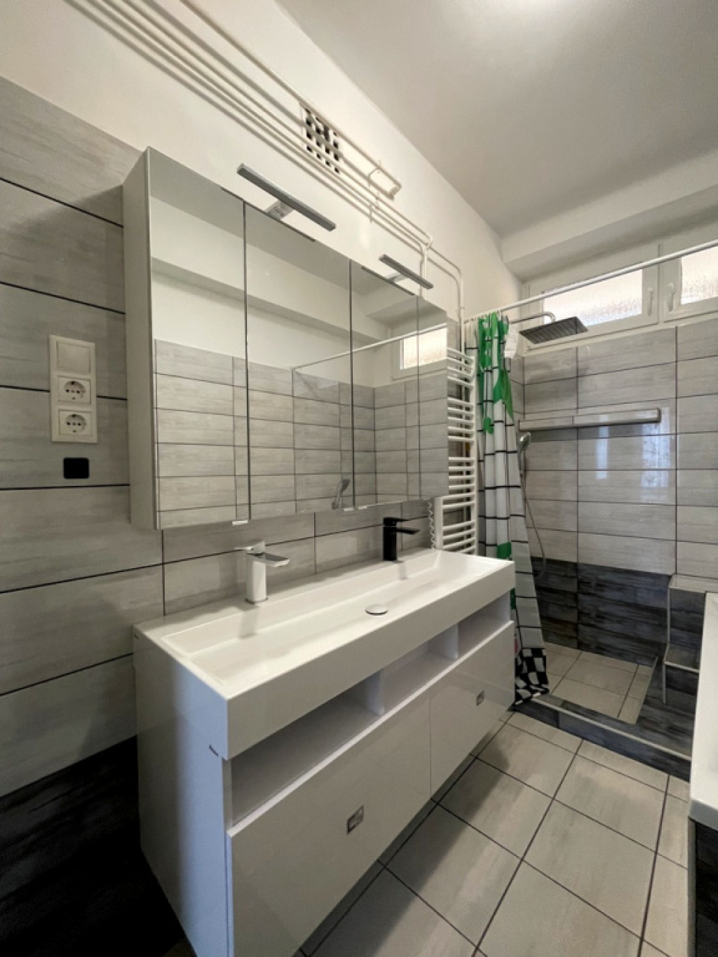 • Fürdőszoba: esőztető zuhanyzóval és káddal, kétmosdós beépített bútorral, törölközőszárítóval és mosógéppel felszerelt