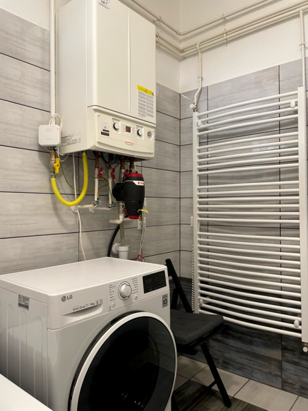A lakás fűtéséről és a használati meleg vízről kombi gázkazán gondoskodik, termosztátos szabályozással. A nappaliban fűtő–hűtő klíma biztosítja az egész éves komfortérzetet.