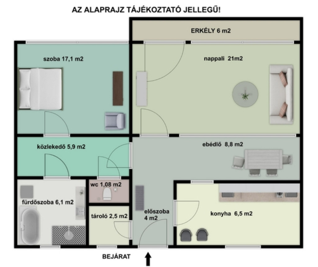 Az előszobából nyílik a konyha, az étkező és egy praktikus tároló helyiség. A tágas, világos nappalihoz egy 6 m²-es, főutcára néző erkély kapcsolódik. A hálószoba, a fürdőszoba és a különálló toalett a közlekedőn keresztül, a közösségi terektől elkülönítve közelíthető meg.