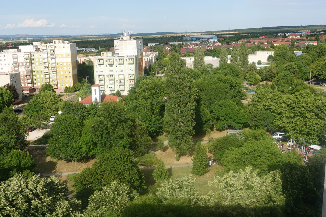 A 10 emeletes épület 10. emeletén található lakás KELETI FEKVÉSÉNEK köszönhetően RENDKÍVÜL VILÁGOS, nyáron kevésbé melegszik fel. A lakásba belépve egy előtérbe érkezünk, mely egyben az előszoba is. Innen nyílik balra a valóban KÉNYELMESEN TÁGAS NAPPALI, ahonnan kitekintve POMPÁS KILÁTÁS tárul elénk a Bakonyra.