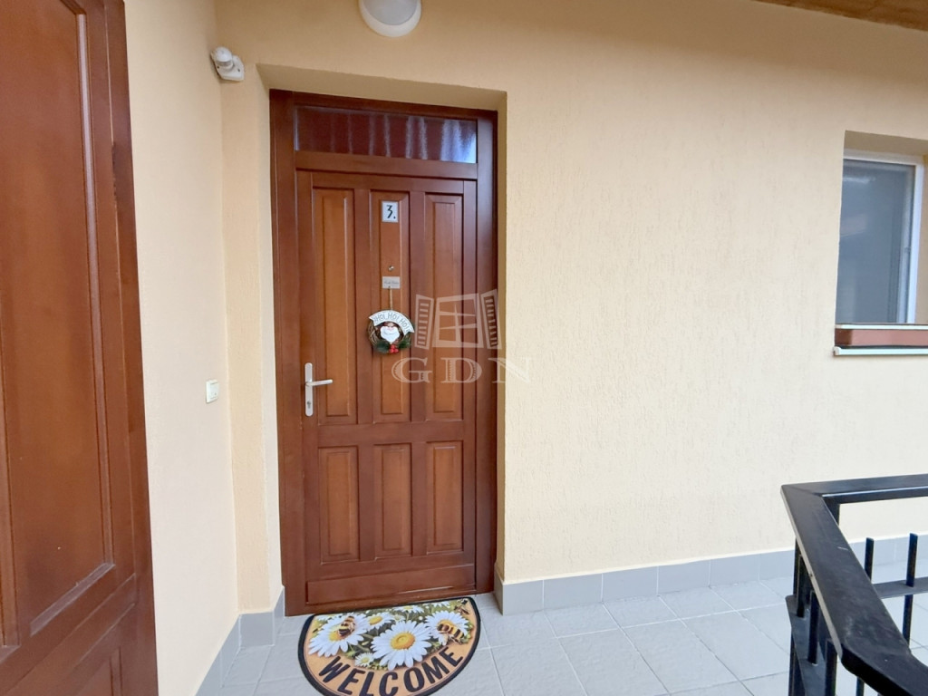 A zárt udvarról megközelíthető tégla lakás tágas terek által ad helyet egy beépített szekrénnyel ellátott előtérnek, egy nagyméretű nappali - konyha - étkező együttesnek, két külön nyíló hálónak - melyből az egyik kapcsolatos a 8 m2 - es erkéllyel, egy épített zuhanyzóval felszerelt fürdőnek, valamint egy külön helyiségben található toalettnek.
